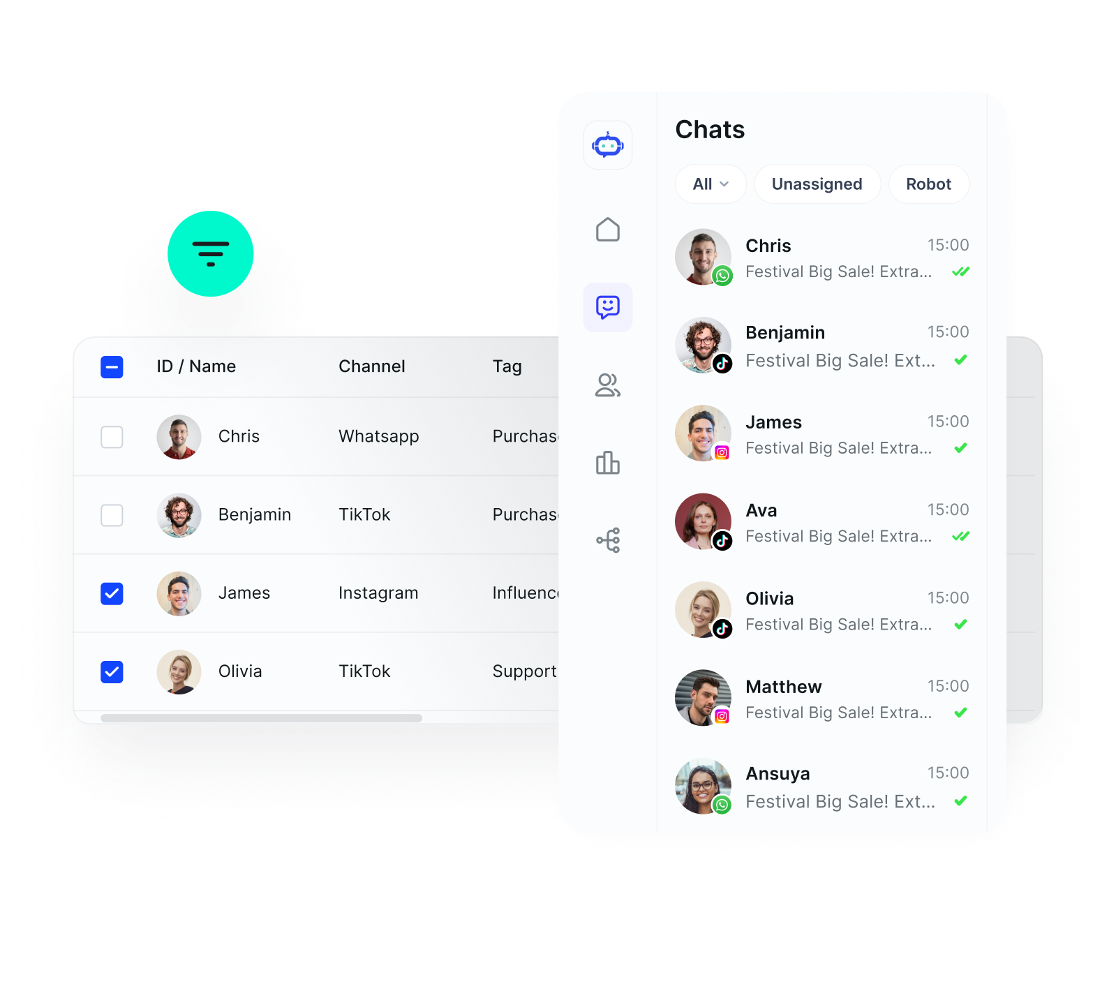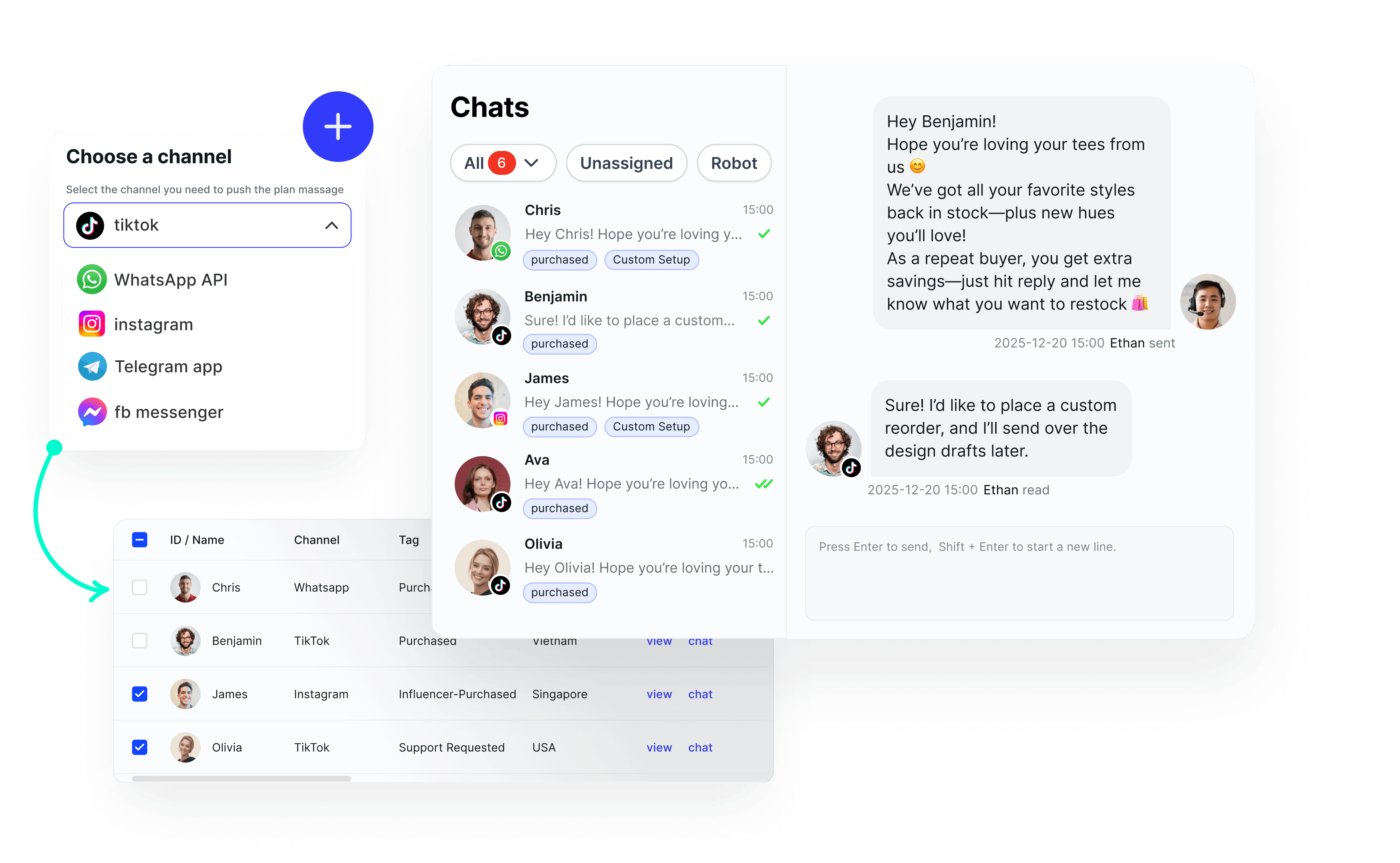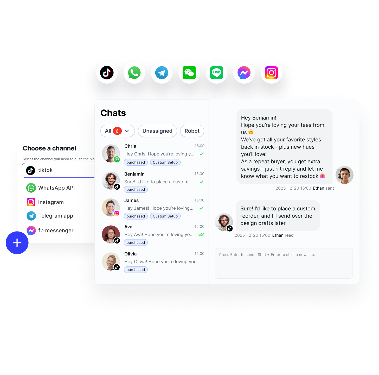 Envie mensagens para vários canais simultaneamente, incluindo WhatsApp, Messenger, Instagram e TikTok, com um único clique para manter a consistência do conteúdo e melhorar a eficiência do alcance.