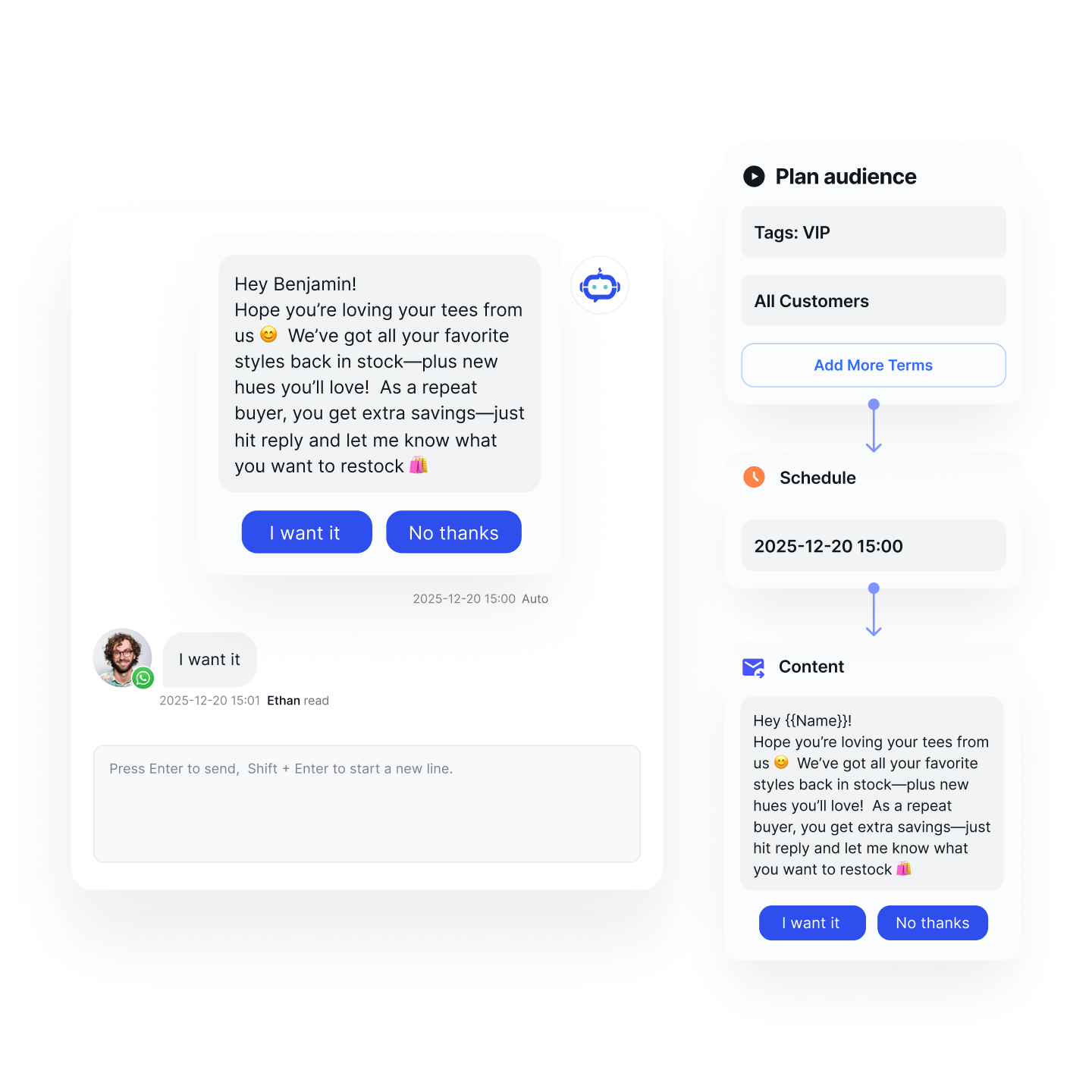 Ao inserir automaticamente nomes de clientes, informações sobre produtos e outros detalhes usando modelos variáveis, cada mensagem em massa se assemelha a uma conversa personalizada, melhorando a satisfação do cliente e as taxas de interação.